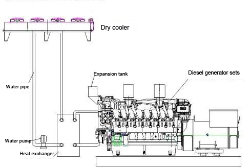 Cooling method: The water in the dry cooler system uses a heat exchanger to cool the circulating water or oil inside the generator.